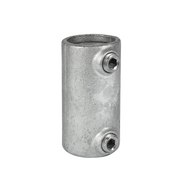 Dieses Verbindungselement eignet sich zur linearen Verbindung von zwei Rohren mit gleichem Durchmesser. Es wird häufig bei langen Geländern oder Rahmenkonstruktionen verwendet, bei denen eine Verlängerung in einer Richtung erforderlich ist. Für vertikale Belastungen ist dieses Bauteil jedoch nicht geeignet – in solchen Fällen sollte das verlängerte Rohr seitlich abgestützt werden. Das Rohr kann ungehindert durch das Verbindungsteil geführt werden, da keine innere Begrenzung vorhanden ist. Wird ein Rohr durchlaufend horizontal eingesetzt, sorgt eine zweite Madenschraube im Verbinder für zusätzliche Stabilität und bessere Zugfestigkeit an der Verbindungsstelle. Zur Auswahl stehen Ihnen das Verlängerungsstück für die Durchmesser 26,9 mm (3/4"), 33,7 mm (1/2"), 42,4 mm (1 1/4"), 48,3 mm (1 1/2") und 60,3 mm (2"). Das Material des Rohrverbinders Typ 8 ist verzinkter Temperguss.