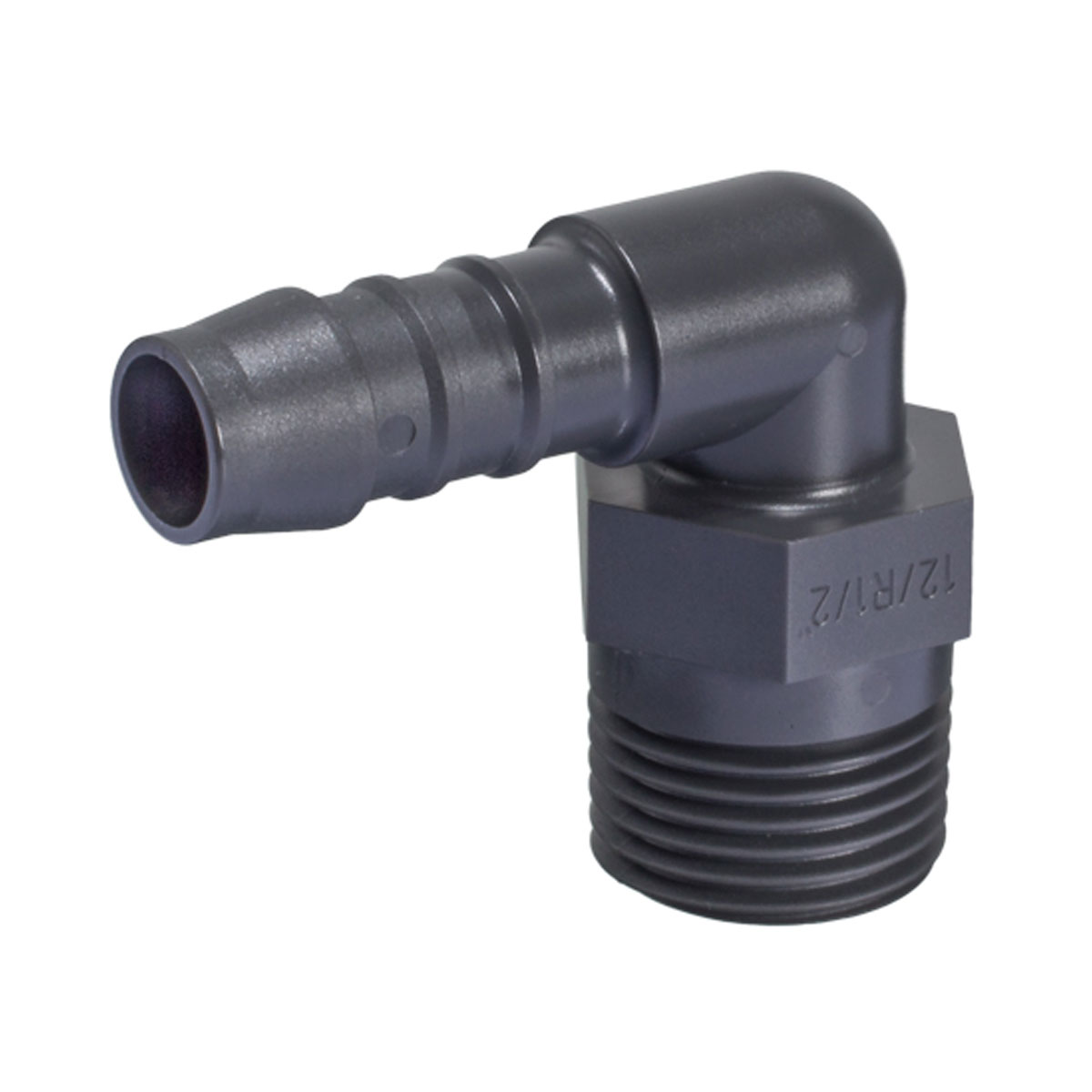 Winkel-Einschraubstutzen Der N8E12 Winkel-Einschraubstutzen mit einem 9,5 mm (3/8") Schlauchanschluss und einem 1/4" NPT Gewinde. Material ist Polypropylen.